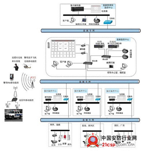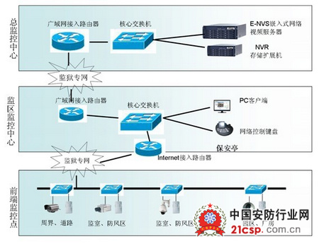 2)系统构架分为总监控中心、分监控中心、监室及放风区的三级构架,三级之间通过监控专网连接;与领导办公室之间采用专用IP网络连接;