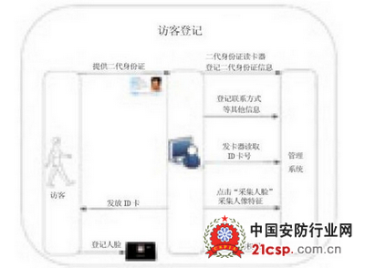 如(图3)所示,访客提供二代身份证(一代身份证目前已经面临作废,持有数量很少,暂不考虑),工作人员利用二代身份证读卡器读取二代身份证内人员信息(包括姓名、性别、出生年月日、身份证号、家庭住址、本人照片)。在系统中建立人员档案。工作人员点击系统接口中的"采集人脸",窗口前的登记设备跳转至人脸采集接口。录入来访人员人脸特征。并为来访者分配权限(如:规定来访者四个小时之内通过某几道门,超出四个小时,权限作废)。访客出门后,用ID卡换回身份证,同时管理员将权限注销。ID卡可再次利用,发给下一位来访者。