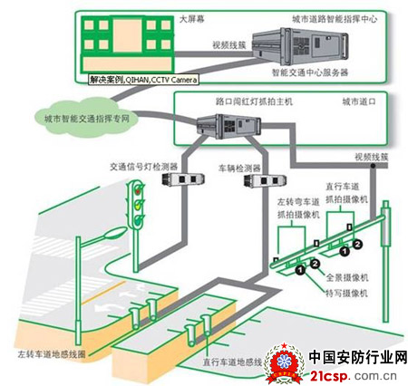 道路闯红灯抓拍系统(闯红灯违章监测系统)由检测、拍照、识别、数据存储传输及中心管理四大部分组成;其中检测、拍照、识别、数据存储传输放置于路口端,中心管理设备及软件放置在指挥中心。
