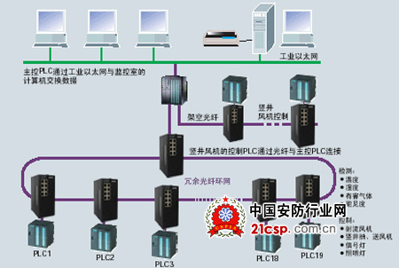隧道现场监控系统由监控室、区域控制器和通讯网络组成。现场监控室内的控制计算机通过工业以太网与主区域控制器连接,获取监控系统的数据并发送控制命令;19个区域控制器根据就近原则负责一定数量机电设备的监视和控制,包括温度、湿度、有害气体及能见度的检测,以及风机、照明灯、信号灯及情报看板的控制;主区域控制器与其他19个从区域控制器通过PROFIBUS光纤冗余环网交换数据,获取各区域控制器的数据并协调隧道内机电设备的动作,包括PROFIBUS冗余环网上的19个区域控制器以及控制竖井风机的区域控制器。