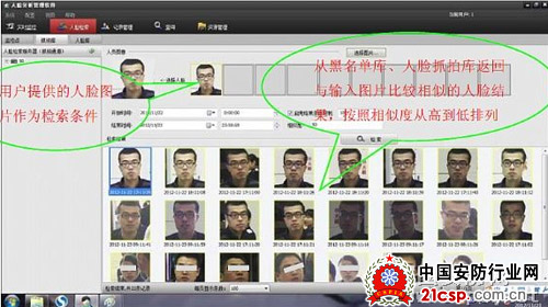 在系统中输入待查询的人脸照片,系统自动检测出照片中的人脸信息并截取人脸,用户选择需要检索的人脸后进行相似度、时间段等参数设置后在对应的人员信息库内开始检索,最后检索出的相似人脸的结果会在界面上显示出来,实现人员信息的快速确认。