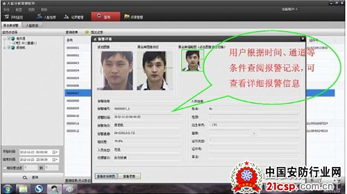 系统可以根据需要把要布控人员的信息(包含姓名、性别、身份证号、家庭住址、人脸照片等信息)加入到黑名单数据库。然后按照时间、地点、布控等级、相识度报警阈值等信息,对人员进行布防。系统对在安检口的人员实时与黑名单数据库中的人布控人员进行实时比对,如果人脸的相识度达到设定报警阀值,系统自动可通过声音等方式进行预警,提醒监控管理人员。监控管理人员可以根据双击报警信息查看抓拍原图和录像进行核实。