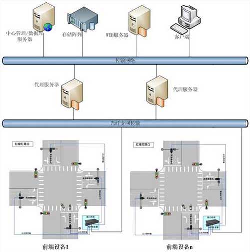 主要承担将前端设备记录的车辆违法信息传输到后端管理中心的任务,同时操作人员在中心平台应用远程管理软件通过该网络可对前端设备进行远程管理、状态监测及设备参数设置。该传输网络可以采用光纤通讯、电话拨号、数据专线、宽带网络、光纤网络、无线3G等方式。如果与视频监视系统共用光端机,可采用数模复用光端机,即在一根单模光纤上传输视频监控系统前端摄像机的视频信号及控制信号,同时提供100M的以太网口用以传输闯红灯电子警察自动监控系统前端设备记录的违法车辆信息。
