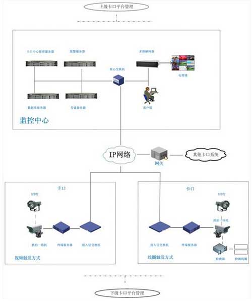 网络通讯子系统主要实现卡口车辆记录部分和指挥中心管理部分的数据和图像信息的传输系统拓扑图: