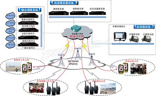 如图所示,整体方案由调度服务器、录音服务器、传真服务器、语音网关、音频接入网关、集群对讲网关、无线中继网关和各种类型终端设备组成,所有设备均直接接入到机场IP网络上实现统一通信和调度指挥。通过该平台可实现机场指挥通信服务、数字录音服务、短信服务;通过网关设备实现与机场数字会议系统、音频扩声系统通信;系统具备丰富、标准的接口,完善的组网能力,可实现与公网、专网、内网的融合组网;系统提供统一的调度控制界面,完成跨网呼叫与调度。为机场日常通信和应急事件提供系统支撑。