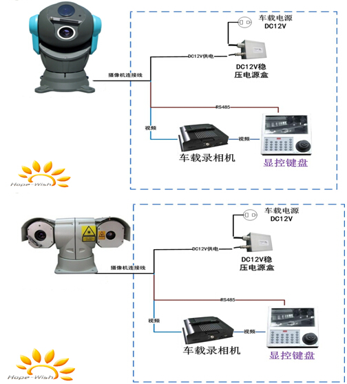 和普威视为车载巡逻监控系统设计的HP-BRC、HP-BTVC及HP-CTVC系列、针对各种巡逻车所研发的系统,集成热成像摄像机、可见光摄像机或可见光与热成像相结合的双波段摄像机、车载抗震云台、车载升降系统、录相、显示控制键盘、车载稳压电源等于一体的的车载昼夜监控移动平台。