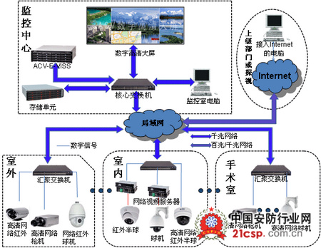 根据客户的要求及实际的环境情况,该系统从结构上划分为:前端监控点(全网络摄像机,包括百万高清摄像机)、视频信息传输(医院的内网、接入外网Internet和监控专网(可选;本方案未接))、后端监控中心系统(存储、管理、显示等)、上传到上级的监控中心/部门和远程监看、回放,患者亲属可通过互联网远程视频探视亲友等(如下图)。