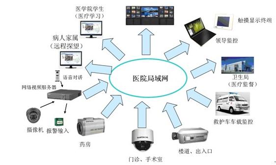 整套系统构架可进行多级用户密码管理,实行用户分级,不同级别用户拥有不同的操作权限,同时,此管理功能可灵活设置和更改,提高了系统的灵活性和安全性。除了实现基本的医院环境安全监控之外,系统还可实现紧急消防广播、病房远距离免接触监护、远距离免接触探视、医院办公评估监控、电子巡更、远程问诊、手术教学观摩、专家视频会议与技术探讨等功能。在以上实现的诸多功能中,值得提出的是,远程探视、手术示教这两者的应用。