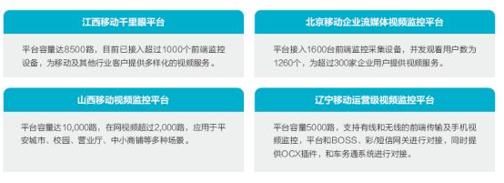 典型案例 湖北移动蓝天卫士项目 系统平台将分散、独立的视频采集点通过有线和无线等多种网络接入手段进行联网,在集成电子地图功能的辅助下360度无死角自动巡视,快速定位秸秆焚烧现场,对现场进行火焰检测、烟感检测等智能分析。 当检测到画面内有烟火时,自动触发报警,告知后台客户端平台及手机客户端。使执法人员第一时间掌握现场情况,及时赶到现场处置,大大增强监管力度,为达到“不着一把火、不冒一处烟、不污一条河”的禁烧目标,提供强有力的保证。 该项目实现了跨区域、统一监控、统一存储和统一管理,形成一种对各行各业都行之有效的监督手段和资源管理方式,为湖北多样化惠民信息服务、新型智慧城市建设提供了有力支撑。 浙江移动千里眼平台项目 项目共部署了1个省级管理平台和11个地市功能应用平台,总容量3万路,已开通营业厅监控量1.2万路,行业监控量18000余路。 该平台为浙江省内多行业用户提供视频监控业务:宁波轻轨监控、温州平安校园、杭州法院庭审直播、衢州公交监控、智能家居、浙江勤业建工集团工地监控、温州中小企业视频监控、营业厅服务质量监管。 平台广泛应用于公安、水利、城管、林业、物流、教育等多个行业,是浙江移动参与政企客户部信息化建设最重要的产品之一。