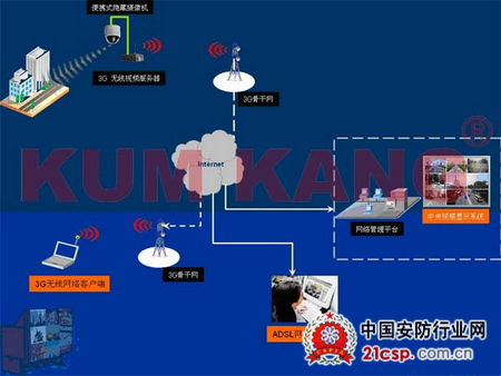 首先在需要进行临时布控的地点安装监控设备,并连接BWS-3G无线视频服务器,采集到的视频数据流通过3G骨干网络进入INTERNET,监控中心通过INTERNET网络对所有布控点进行视频监控。同时通过ADSL、ISDN、DDN、3G无线网络等多种途径对监控点进行管理。