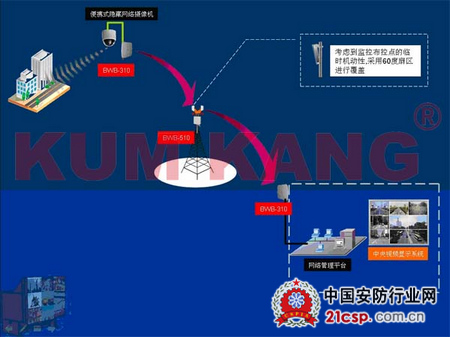 本方案采用WLAN技术进行对临时布控点的视频采集工作,监控点安装摄像机通过无线网桥把视频信号传送到中继站,再通过中继回传中心站。这种设计完全脱离INTERNET网络,在安全上要比3G网络更可靠,同时免去租用3G网络的高额费用,一次性投入。但对环境要求较高,无线网桥传输要求可视传输。