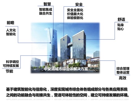 中安消城市综合体解决方案着眼于未来,处处彰显科技与智慧,以架构于云技术、大数据、互联网、物联网的集成服务平台为核心,利用设备集成、信息集成、应用集成、界面集成等多种方式,基于建筑智能化与信息化,涵盖智能建筑、低碳节能、城市文化、商务开发及管理运营等多个维度,深度实现城市综合体各组成部分与各类应用系统之间的功能融合与衔接共生,为城市综合体赋予舒适、安全、智慧、高效、节能的综合特性,营造可体验性的空间,建立可持续发展的环境,实现人、建筑与环境的和谐共存,并最终体现城市综合体的真正内涵–对生活的尊重。