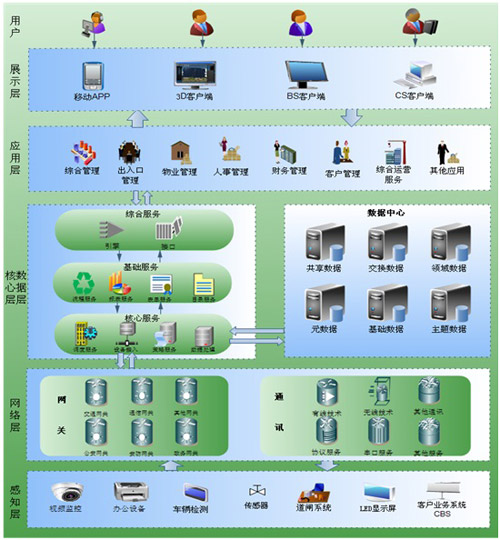 网络层负责各种数据的传输,包括各种网关与通讯服务等;核心层由综合控制平台与数据中心组成,负责处理各种事务与数据,如图中标示的各种核心服务、基础服务与综合服务,它是整个系统的枢纽,负责将来自下层的各种信息向上提供,并将来自上层的反馈信息向下进行处理与传达;数据中心是数据的集散地,负责数据的存储、转换、分析、处理、分发等任务;应用层由来自下层的服务组件组成,用以实现面向不同用途的应用整合,如安防、人事、财务、客户管理等;展示层负责向终端用户进行最终呈现,并接收、传达用户反馈,实现用户与应用之间的交互。