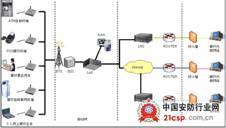 银行采用GPRS&CDMA无线网络方式构建无线组网系统,在非常安全可靠的组网条件下,建立起了银行无线交易的行业系统,大大拓展了移动数据应用的领域以及银行业的进一步扩展。