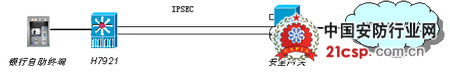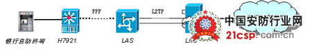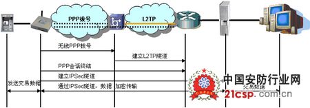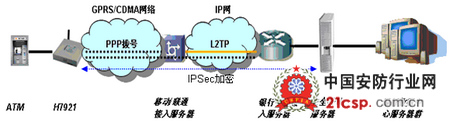 在上图4中,银行ATM自助终端通过目前的GPRS&CDMA无线网络接入终端,实现网络连接,移动/联通等运营商提供了接入服务器LAC,通过无线终端设备向运营商接入服务器LAC发起PPP拨号,实现与银行中心接入服务器LNS之间的L2TP隧道的建立,并将无线终端的PPP拨号转向银行接入服务器LNS,最终实现无线终端与LNS之间的PPP会话的建立,在银行网络核心,部署一台安全VPN服务器,接受来自无线网络接入终端的IPSec会话请求,通过与ATM自助终端无线VPN终端之间建议IPSec隧道,实现相互之间数据传输的安全加密。