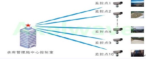 该系统主要由三部分组成,前端视频、语音、数据等采集系统,无线网络传输系统,水库管理中心控制系统。前端的多路视频、数据及IP电话等都先通过交换机进行汇聚,然后进入艾克赛尔(Axelwave)的无线网桥进行无线传输,所有前端点都采用太阳能供电系统供电,在阴雨条件下可以支持连续工作72小时以上。中心水库管理控制室与前端组成点对多点的无线传输链路,将前端的所有信息汇总至控制室。控制中心可以实时监控各前端点的视频图像,如水库水位情况,闸门、大坝的工作状态,水面及岸边情况等等,另外还能观察到前端发回各种的实时数据信息,如水库水质变化、水库天气变化等,真正做到对水库各重点区域的全天候、多角度、全方位的实时监控,做到有效应对各种突发事件,确保了水库各方面的安全运行。