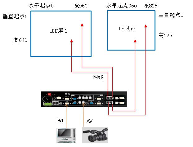 (2)960*640点LED显示屏显示电脑DVI信号,896*576点LED屏显示摄像机AV信号