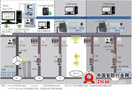 A、B两组门分别由两套控制器控制、A组武警看管、B组民警看管,各需A、B两种卡验证通行;卡片可自由选择ID、IC、CPU卡,本方案推荐安全度较高的IC卡,进出人员需刷卡或刷卡+密码;可在任意通道门的外出方向安装安全系数更高的生物识别设备,如面相识别器、掌形仪等,对外出人员进行生物特征识别。