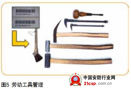 对于生产过程中涉及相关劳动工具的发放均实现电子化记录,通过在工具上加装条形码或RFID识别卡(如图5),由系统扫描后统一发放和回收,自动对比工具数量及类型,出现异常自动报警,在未解除报警的情况下生产车间犯人均不得离开,防止出现私藏工具等违规行为。