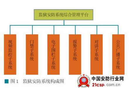 监狱安防系统中需要监控的场所主要包括院区外围、厂房、监舍、家属接见室、食堂、医院以及禁闭室等,监控安防系统建设任务包括专用网络、视频监控系统、报警系统、监舍对讲系统、门禁系统及电视墙显示等系统,其中重点建设的是网络系统、视频监控两个主要部分,此外,还包括对周界报警系统、门禁系统以及与监狱已有子系统的建设和集成如(图1)所示。