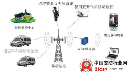 为了实现对监所的无死角监控,在巡逻警、运囚车和警用直升飞机上装载无线传输的移动监控设备,充分保证监控中心对监所各个区域和场所的实时监控,及时解决突发事件。