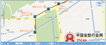 经过对图像资料多方面的分析后,掌握到嫌疑人的各项特征,包括体貌特征、穿着打扮、携带物品,同时对嫌疑人的来去路线、是否乘坐交通工具、嫌疑人周围出现的人员车辆、是否使用手机、是否出入旅店网吧的情况进行了解,并在监控分布图上针对分析研判过程中发现的情况进行标注,制作嫌疑人轨迹分析图,以地图的方式直观的、清晰的反映嫌疑人的行动轨迹、活动规律,全面了解整个嫌疑人或嫌疑团伙在作案与逃逸过程中的信息。在分析到新的线索后,重新设定搜索范围,进而继续摸底排查,通过视频的方式获取更多的线索。