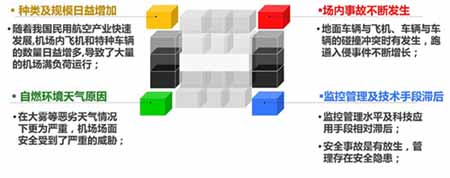 对国内大多数机场来说,机场现场运行指挥基本是塔台监视,辅以一些语音设备来管理机场停机坪的各种地服特种车辆,对于繁忙的航空港,这种传统的目视指挥管理手段无疑是一个潜在的安全瓶颈,导致了机场安全事故的发生和处理效率的低下。而场面监视雷达极其昂贵,运行成本高,在国际上也只有少数的大型机场使用,很难在中小型机场推广普及。