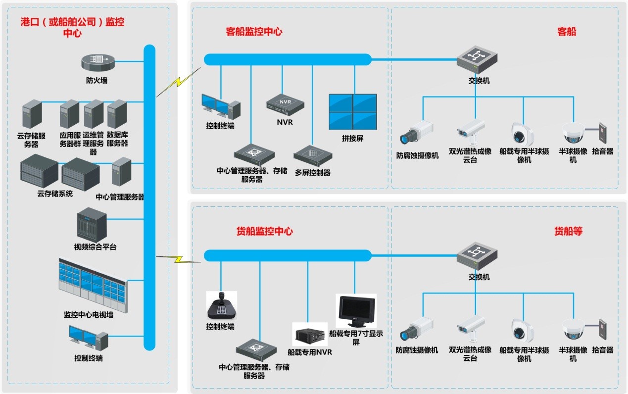 海康威视海事船载视频监控系统基于IP网络架构,通过在船舶上部署各类摄像机、拾音器、报警按钮、语音对讲等装置,可在船载监控中心实现对内部重要部位和外部环境各个场景的监控,同时系统支持多级联网,实现船载监控中心、港口监控指挥中心的二层架构。