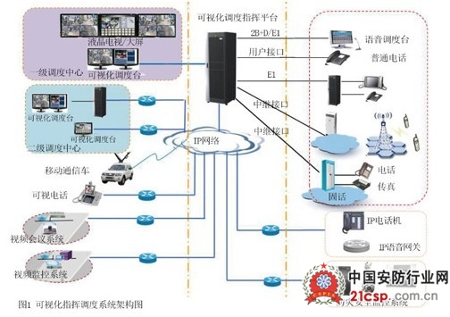 可视化指挥调度系统是基于IP网络,集可视指挥调度、实时图像接入、传真群发、短信群发、电子白板、公文流转等功能于一体的综合通信系统。系统架构遵循下一代网络(NGN)的分层及标准、全开放的软交换体系架构实现业务控制与业务承载相互分离,提供优质的双向语音和清晰的实时动态图像,成功的将语音通信、数据通信和视频通信相结合,构建一个声影并茂的指挥调度网络。因此,可视化调度通信是客运专线调度系统的发展方向,是充分发挥客运专线运营调度系统优势的重要支撑系统,是整合现有安全管理系统的最好手段。并且铁路综合数据通信网核心内容就是建设以IP数据网为代表的信息化基础网络,形成铁路的信息化网络平台,为可视化调度系统的建设提供了良好的承载网络。可视化调度通信系统采用TDM/IP双网络架构,可兼容现有的电路交换设备,同时支持IP业务的扩展,实现可视化调度通信。可视化调度系统同时具备视频会议、视频监控、应急指挥系统的功能,并且可接入防灾安全监控系统,是一个综合性的平台,组网示意图如图1。