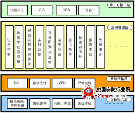 核心管理层。包括系统管理软件、应用管理服务器、转发服务器、存储服务器、浏览工作站、访问控制服务器、网络存储、解码设备等。