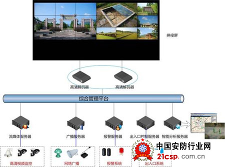 本高清监控系统分为前端采集设备、传输存储设备、后端大屏幕及控制设备,主要对围墙、出入口、人行通道、场景、停车场、监控室等重要区域进行长时间录像,监控系统采用高清网络NVR+IPSAN磁盘列阵存储方式,便于今后监控图像的保管需要。视频图像有编号、时间、部位、日期等信息,实行自动或手动切换,图像的记录及存储均采用高清模式,所有的控制集中在中心控制室管理。