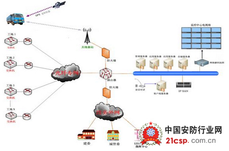 为规范监控网络传输,以及考虑监控信息的安全性,本系统为光纤网络传输系统,视频、控制信号采用视频线(SYV75-5/96编)接入到各个建筑工地监控站点的硬盘录像机(DVR),再联入各个工地监控点的网络设备(光纤网络交换机),再通过电信10M光纤专网传送到监控中心的核心交换机,联入中心局域网进行统一管理、解码显示、集中存储。