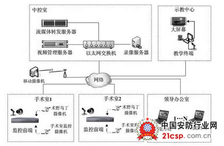 手术视频监控转播示教系统从结构上分为手术室子系统、手术教学子系统、交换控制中心子系统、网络子系统四个子系统,整体系统的结构如下图: