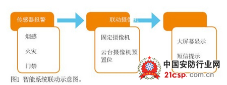 在该方案中,这种联动信息依靠的是智能化的图像分析技术,智能分析系统目前常用的包含了目标行为分析和特征分析。以经常发生误报的烟雾探测器为例,当烟雾探测器发生报警时,报警信号通过干接点或其他方式发送给智能数字视频系统,对烟感周边的单个或多个摄像机图像同时进行图像内容分析,当分析结果判定为浓烟时,则发送反馈信息给报警系统提升报警级别,提示管理人员关注问题;而分析结果判定为图像正常时,则发送反馈信息给报警系统,提示为误报,可选择关闭报警或降低报警级别待人工关闭报警(图2)。