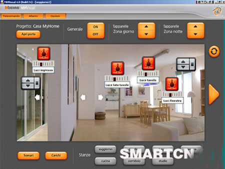 触摸屏控制:客厅采用10”触摸屏、家庭厅采用3.5”触摸屏,主卧室安装有一个15”触摸屏,休闲厅采用一个无线触摸屏。通过触摸屏可实现点对点控制、组控、区控、总控、场景控制功能,可控制所有智能家居设备,对灯光进行定时延时开关,在门厅和庭院灯进行应用,并具有闹钟功能,如早上7:00打开指定卧室灯光和其他设备,可设定循环时间,周一至周五7:00,周末调至7:30进行相应操作。触摸屏中可控制各层灯光设备,如在一楼控制二楼和三楼灯光设备的关闭,方便居家时灯光的管理,并可根据需要选择控制的区域和设备。用户根据需求可自定义灯光图标、和其他设备图标,图标直观地对应相应的设备,并即时、准确反映出被控的各种设备的工作状态。所有触摸屏均升级为中文操作界面,15”触摸屏可将房间实际图片导入,图标位置可自由移动到实际控制对象的位置,点击灯处图标,对应位置的灯点亮,图标上显示工作状态和亮度状态,通过图上指示通道入口箭头光标进入下一个房间或区域的图片控制界面,如下图所示: