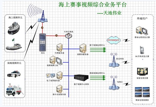 该平台系统专为大型无线网络视频系统设计,适合于海上赛事这种监控点数和用户数较多、系统需多级管理、权限划分细致的场合,并针对现场无线环境的特殊性,增加缓存和延时的调节,有效的缓解无线网络的不稳定因素,保证了现场的图像的效果。