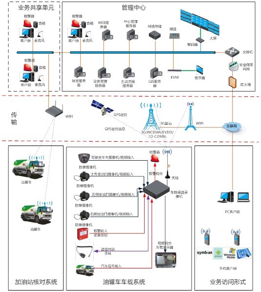 车载监控系统:主要通过在油罐车上安装车载监控主机、摄像机(驾驶舱位和进出油口)、拾音头、GPS定位系统、报警按扭、对讲装置、无线传输模块等设备,车载前端存储D1格式视频,按照预先的设定借助3G/Wifi无线网络,上传CIF格式视频,并且把车辆的行驶状态、实时位置、车内情景、工作人员工作状态及一些突发事件的实时场景传输到管理中心,实现对运行中的油罐车辆进行监控,并完成突发事件下的车辆报警、鸣警等应急处理。