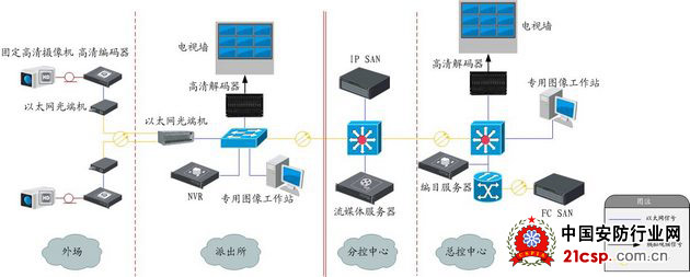 派出所与分控中心、总控中心之间通过万兆图像网互联,实时点播流经分控中心流媒体服务器转发至总控中心,供总控中心专用图像工作站软解码查看,也可送入插卡式高清解码器硬解码上墙显示,存储流送入分控中心IP SAN进行存储。