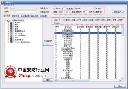 每个用户都有一定的控制权限和访问权限(参见图3),控制权限对用户所能做的操作(如添加摄像机、解码器等)进行日志记录;访问权限则限定了用户能对哪些区域的设备进行监控调度,分别对不同的部门领导、企业园治安负责人等设置不同设备访问权限。因此可以保证监控系统很高的安全性,并使管理更加有效。