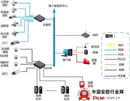 油库现场监控系统负责完成前端的音视频信息、告警信息的采集、缓存、编码、存储及发送等功能,并可接受来自网络的控制指令。