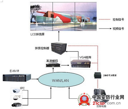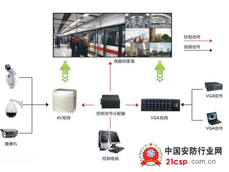 4、控制PC主机通过控制信号分配器分别与AV矩阵和拼接屏相连, LCD大屏内置拼接器,可实现拼接功能,实现整屏显示单路画面,混合显示多路信号,每单元屏显示任意一路信号。