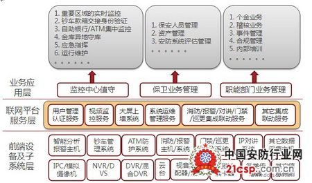 DCCS新一代i3金融联网解决方案分为三层:前端设备及子系统层、联网平台服务层和业务应用层。前端设备及子系统层是最底层,负责前端各种设备的接入和控制;联网平台服务层是中间层,提供系统管理、数据转发、多系统联动等基础服务;最上层是应用层,在平台服务层各种服务的基础上提供监控中心值守、保卫业务管理、职能部门业务管理等个性化应用。