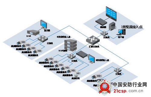 该系统采用全数字化方式,主要包括如下设备:高清网络摄像机、NVR网络硬盘录像机、报警输入输出设备、语音对讲设备、网络管理服务器、视频管理平台等。