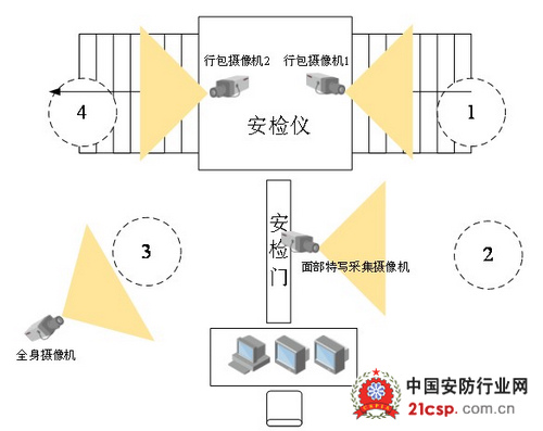 4号点位:旅客结束人身检查后,安检仪完成物品扫描,通过传送带从暗箱把物品传出。在安检仪顶部或一侧安装设置高清网路摄像机,或者结合原有站内摄像机,监控视角范围为从旅客在安全检测位置,到传送带传出部分取走物品。实现安检管理员对旅客人员结束流程,取走物品过程进行监控管理。