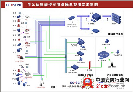 每个摄像机通过光端机将模拟摄像机的视频源传送到监控中心机房,然后进过贝尔信智能分析服务器分析,再用海康的DVR进行实时录像的存储;在中心机房部署对应的视频分析器,事件分析器同时联结网络,一旦检测到意外事件,通过开关量信号立刻将信息发送给报警服务器。这样可以做到公路内的全程事件监控。必要的话,报警服务器还可以通过管理服务器将相关的数据传送给总集成系统以便控制相应的交通灯以及信息屏。