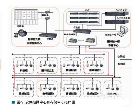 作为大运村的安保指挥中心和存储中心,大运村一标段图书馆六楼安保指挥中心、图书馆一楼存储中心,其前端设备分布在:科技楼、图书馆会堂、教研组团1、教研组团2、教研组团3、教研组团4、教研组团5、教研组团6、实训中心,前端视频利用光纤传输到存储中心进行编码处理。系统拓扑图如图2。