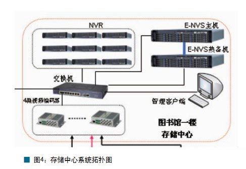 视频存储中心由网络平台、扩展存储NVR、四路编码器、网络键盘、单路解码器、管理客户端组成,共需管理394路视频信号和67路控制信号。存储中心系统拓扑图如图4。