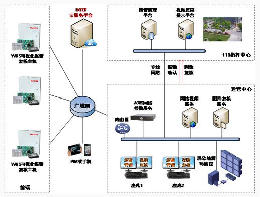 采用VARS可视化报警复核主机构建可视化区域联网报警运营系统,各安防现场无需申请静态广域网IP地址,无需通过宽带路由器进行“端口映射”工作设置,无需申请“域名解析”服务,仅需要分配给VARS可视化视频复核主机的RJ45端口具备广域网接入功能,同时为报警运营中心申请一个广域网静态IP地址,即可完成各安防现场与报警运营中心之间的互联互通。