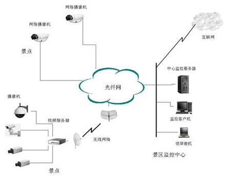 旅游景点比较独立分散,一般可按景区划分,景区内又有若干景点,它们在物理上分布也是比较广的,为了达到通过网站就能看到任何一个景点的图象,建议按以下方式搭建这套系统,并按照监控前端、通讯网络、监控中心三部分分别加以介绍。