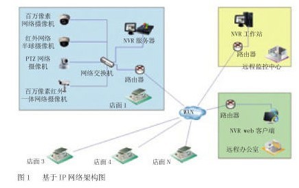 根据用户的需求,基于纯IP架构的网络监控系统成为首选。前端采用网络摄像机,选择不同的型号以满足不同的监控需求,系统架构如图1所示。